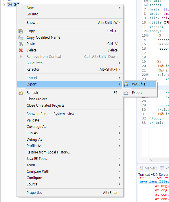1-1. 프로젝트를 우클릭 한 뒤 > Export > WAR file 선택