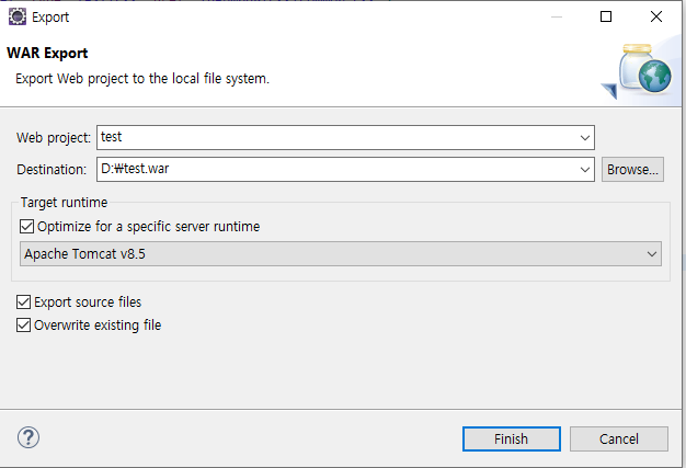 1-2. 해당하는 파일 저장경로(Destination) 선택하고, tomcat 버전 선택하고, 소스코드 포함할것인지(Export source file), 파일 덮어쓸것인지(Overwrite existing file) 체크한다. (Finish gogo)