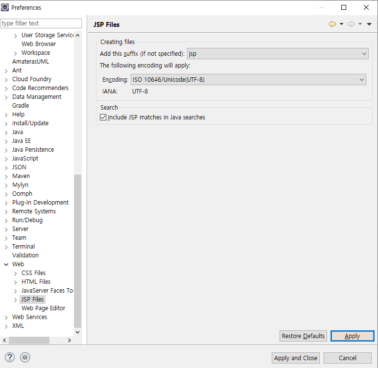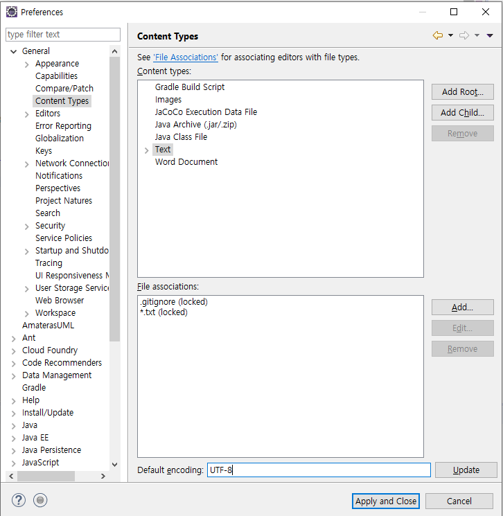 추가로 Text 예하의 다른 설정은 ISO-8859-1로 되어있는데