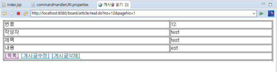 8. commandHandlerURI.properties 수정. ReadArticleHandler가 /article/read.do 요청을 처리하도록 매핑 설정에 추가한다.
