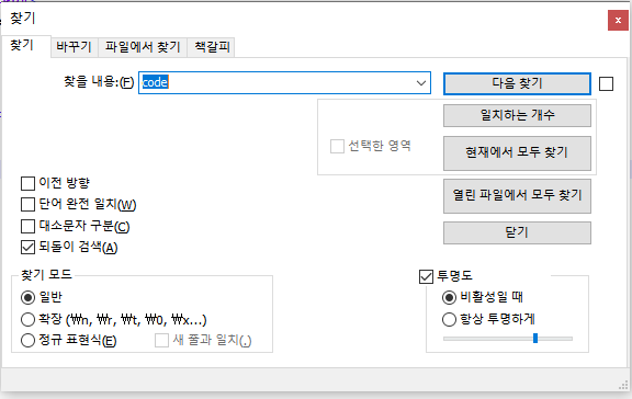 - 찾은 코드를 원하는 코드로 바꿀 수 있다. (모두 바꾸기로 일괄 적용도 가능하다.)