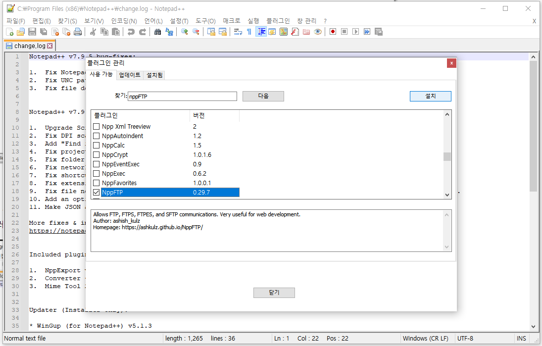 2-2. NppFTP 찾기 > 체크 > 설치 (재시작하냐고 묻는데 재시작하면 하면 됨!)